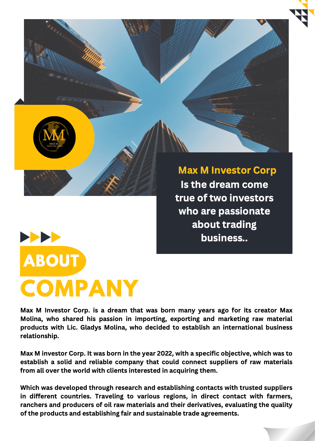 Max M Investor Corp. Specialized in a wide range of raw material products, from grains and seeds to exotic woods and minerals. In addition, it also focuses on organic and sustainable products, promoting responsible agriculture and production.